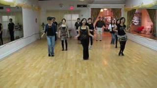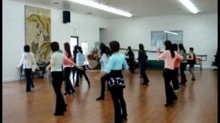 1-4   	Cross right over left, step back left, side right to right side, scuff left across right