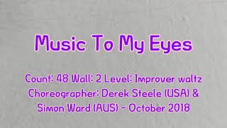 | Music To My Eyes er en smuk og flydende 48/2 improver waltz, hvor vægtskift og kontrol er i fokus. Koreografien udnytter valsens bløde rytme og lægger vægt på balance, rotation og forbindelse til musikken – en dans for dem, der sætter pris på ro, præcision og følelsesmæssigt nærvær.