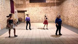 5-6½ right stepping back on left, ¼ right stepping right to right side [3:00]