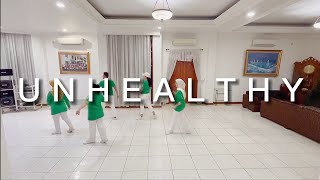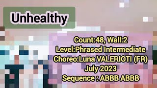 | Unhealthy er en kraftfuld 48/2 phrased intermediate, der leger med kontraster – fra bløde glid til markante accenter. Kombinationen af fraserede sekvenser og klare musikalske hits giver dansen både udfordring og høj underholdningsværdi for den erfarne danser.