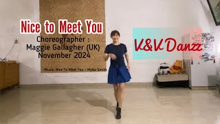 | "Nice To Meet You" er en 32 counts, 4 wall line dance på improver-niveau, koreograferet af Maggie Gallagher fra Storbritannien i november 2024. Dansen er koreograferet til sangen "Nice To Meet You" af Myles Smith. Maggie Gallagher er en anerkendt britisk line dance-koreograf og instruktør med over 500 koreografier i sit navn. Hun er kendt for populære danse som "Highs & Lows", "Listen to My Heart" og "Do It All Again". Maggie har undervist og optrådt internationalt og har sin egen hjemmeside, med nyheder, events og dansescripts.