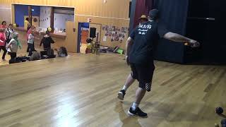 3 4Step left forward, 1/2 turn left sweeping right around into a press forward (weight still left) (3:00)