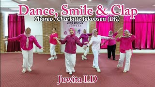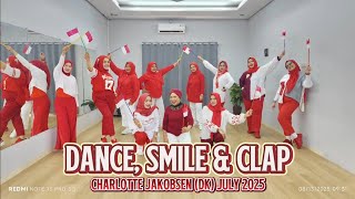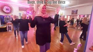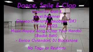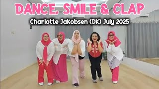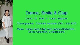 Dance, Smile & Clap er en glad og festlig 32/4 linedance på beginner-niveau, koreograferet af Charlotte Jakobsen (DK) i juli 2025. Dansen er fyldt med lette trin, smil og klap og et par detaljer, der gør den genkendelig og perfekt til både begyndere og danseglade fællesskaber.