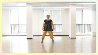 5,6,7,8Big step diagonally fwd R, Drag Touch L, Big step diagonally fwd L, Drag touch R