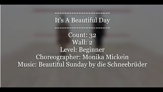 | It’s A Beautiful Day er en glad og ukompliceret 32/2 beginner-dans, der indfanger den lette og livsbekræftende stemning i klassisk europæisk “feel good”-country. Koreografien er bygget op omkring simple grundtrin, små vægtskift og charmerende bevægelsesflow, som passer perfekt til begyndere – og som hurtigt skaber god stemning på gulvet. Den egner sig både til sociale danseaftener og undervisning, hvor man ønsker noget ukompliceret, men alligevel med karakter.