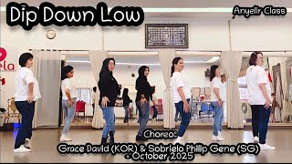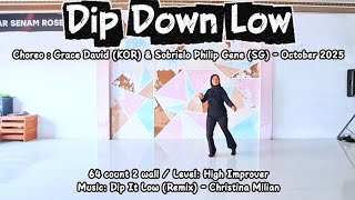 Dip Down Low er en energisk og markant high improver-dans, hvor 64 counts over to vægge giver plads til både groove og klare musikalske markeringer. Udtrykket er urbant og selvsikkert med tydelig rytmisk forankring. Bevægelserne arbejder ned i tyngden og op igen, hvilket giver dansen et pulserende og dynamisk præg.