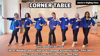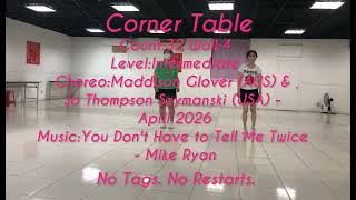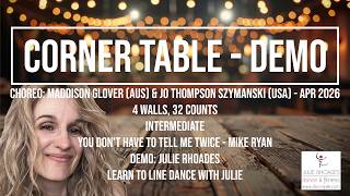 Corner Table er en stilren og musikalsk 32/4 intermediate-dans med et moderne country-udtryk. Koreografien er kompakt, men arbejder med detaljer og præcise overgange.