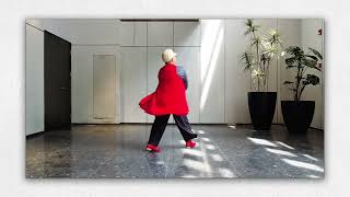 Bevægelserne er kontrollerede og flydende med fokus på linjer og overgangene mellem sektionerne. Udtrykket er roligt og selvsikkert.