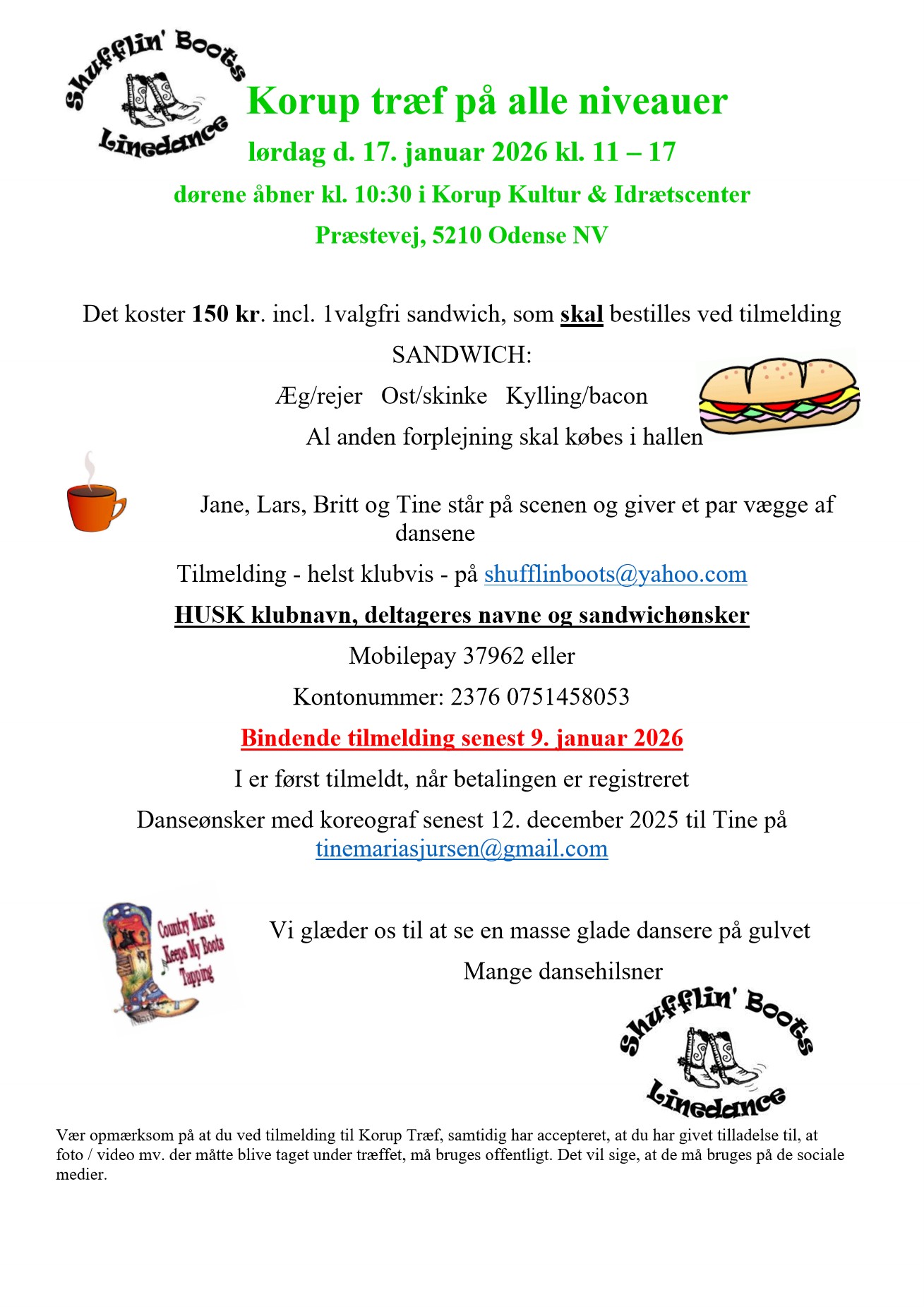 Hos os i Shufflin’ Boots er der plads til alle, uanset hvilket niveau man danser på. Ligegyldig hvor god man er til at danse – møder vi altid hinanden med smil og glæde. Vi danser for sjov og har et dejligt socialt samvær i klubben, både holdene imellem, men også ved arrangementer og lignende – vi griner og hygger os sammen.