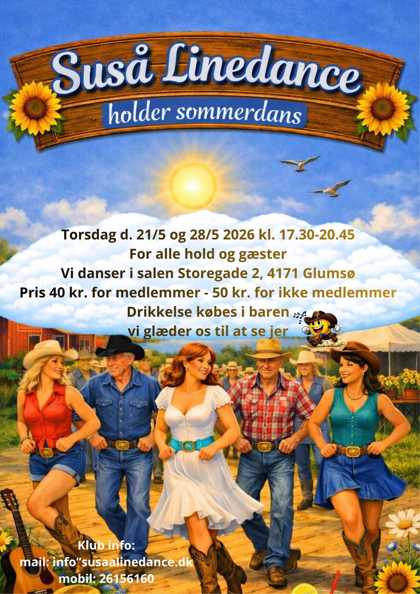 Suså Linedance har eksisteret siden juni 2005, og har hjemmehørende i Næstved Kommune. Linedance er foreningens samlings aktivitet, sammen med socialt samvær. Vi er en COUNTRY KLUB, danser primært til country musik – ny såvel som gammel. Der bliver dog også introduceret andre musikgenrer bl.a. i forbindelse med ud læring af års danse samt populære danse. For mere info: Klubbens hjemmeside suaaalinedance.dk Vores Facebook side: Susålinedance. Eller du kan kontakte os på mail adressen:ala7@mail.dk