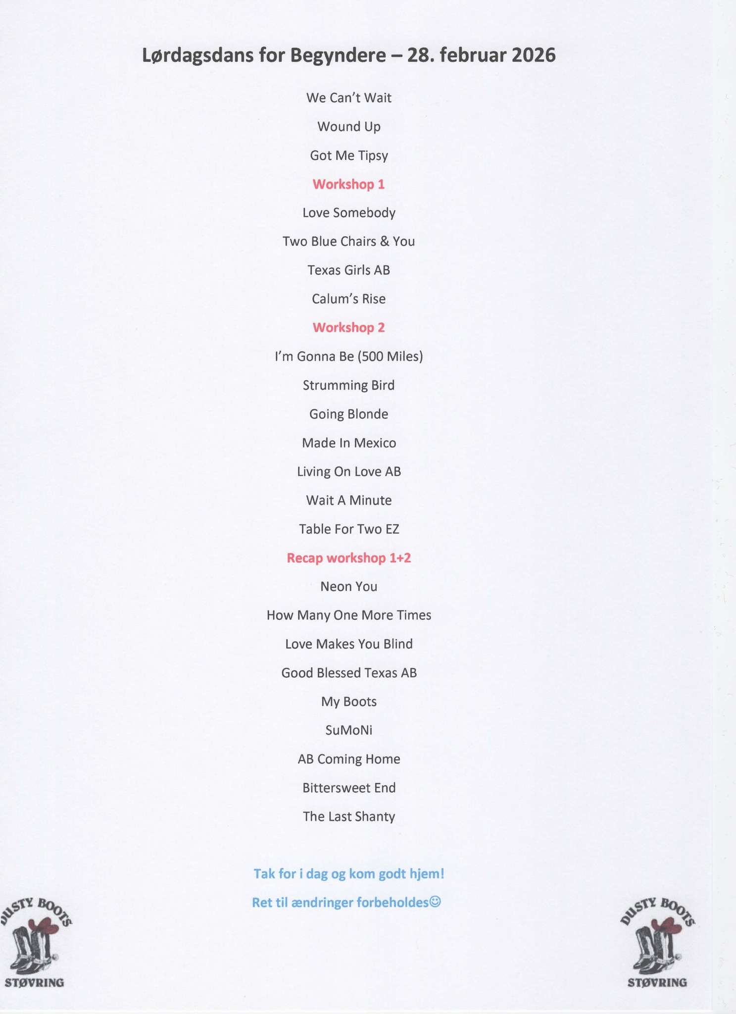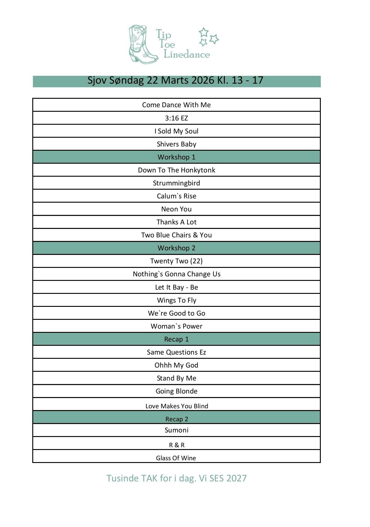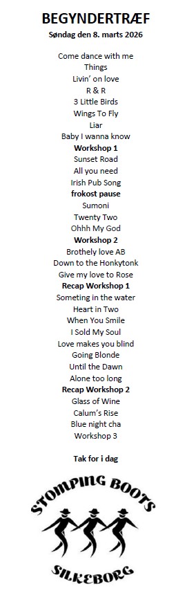 2 workshops og dans efter danseliste med gennemgang af vægge |