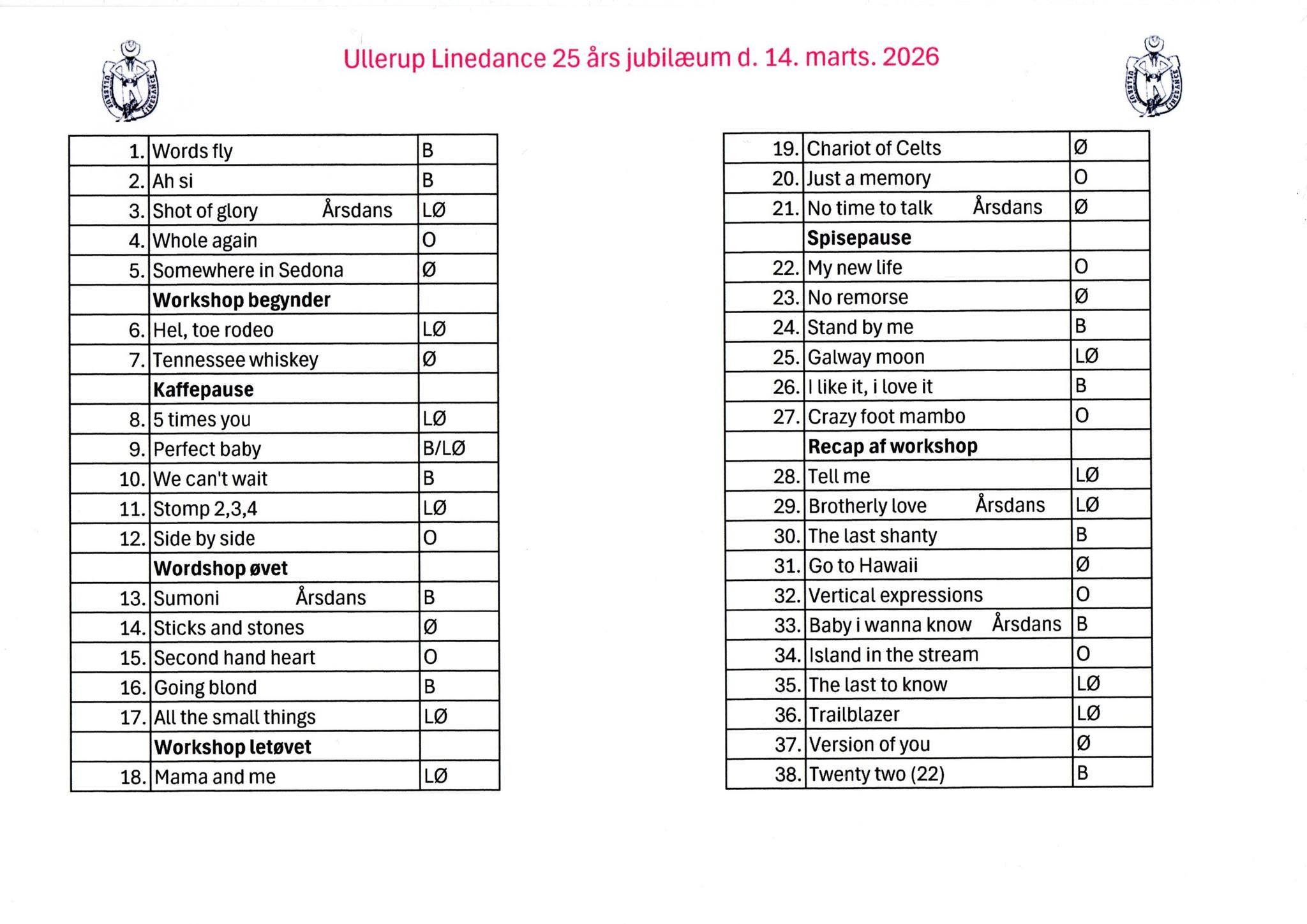 2 workshops og dans efter danseliste med gennemgang af vægge |