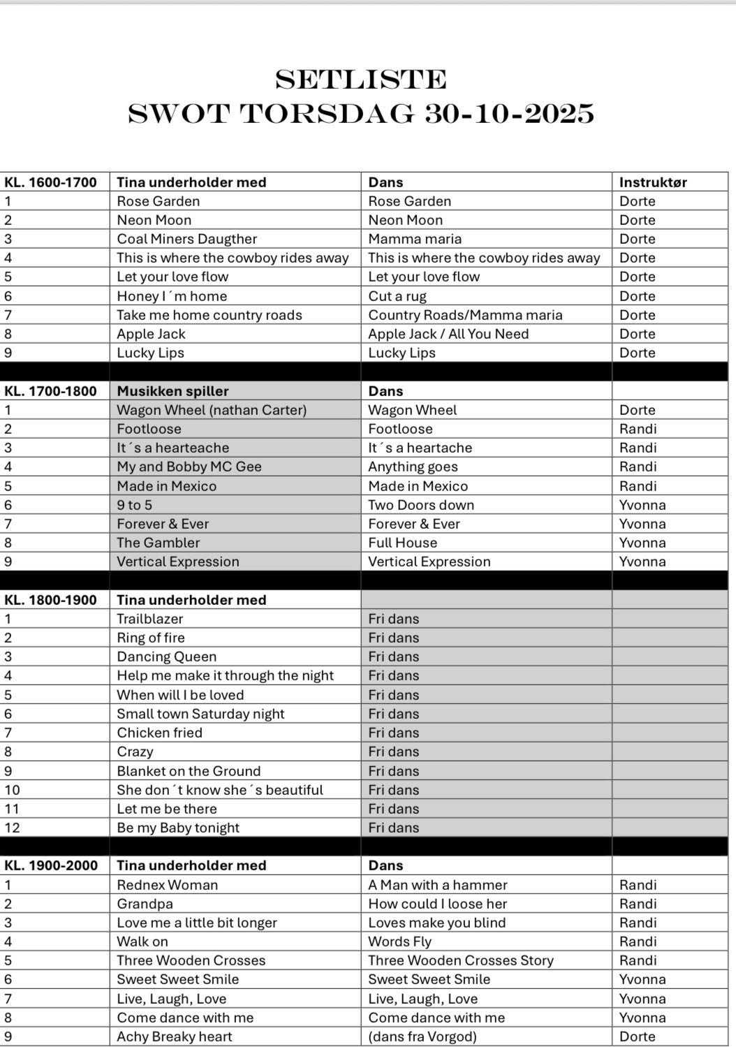 2 workshops og dans efter danseliste med gennemgang af vægge |