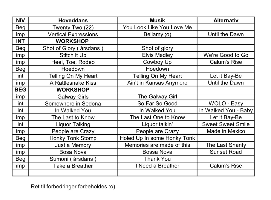 Alle niveauer og alle danse vil blive gennemgået mindst én væg.