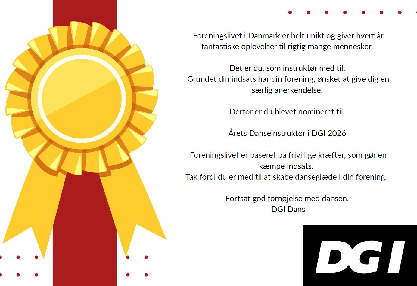 DGI Dans har igen i 2026 sat fokus på det frivillige engagement i dansk foreningsliv med nomineringen til Årets Danseinstruktør. Prisen gives til instruktører, der med stor indsats, engagement og passion er med til at skabe danseglæde, fællesskab og udvikling i deres foreninger.