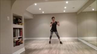 1-2Kick right to right side. Cross step right behind left.