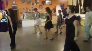 Walk, Walk, Out, Out, Together, Cross, Back, Shuffle ½, with Sweep.