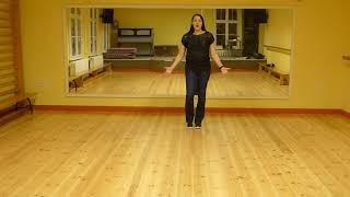 [49 – 56] ½ R (to return to 7.30), ¼ R, R sailor making 1/8 turn R, heel switch L-R, R ball, L fwd, ½ pivot R