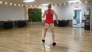 KICK BALL STEP, ¼ TURN, SKATER STEP FOUR TIMES1&2Kick right to right side, step right in place, step left forward3-4Step right forward, ¼ turn left as you step left5-6Skate right, skate left (traveling forward)7-8Skate right, skate left (traveling forward)STEP TOUCH, STEP TOUCH, TROT STEP BACKWARDS1-2Step right to right side, touch left toe behind rightRaise your hands high and stretch you body nice and tall during count 1. Drop your hands to your side and click your fingers while bringing your body back down on count 2. The lower you get, the farther you can cross that foot behind.3-4Step left to left side, touch right toe behind leftRaise your hands high and stretch you body nice and tall during count 3. Drop your hands to your side and click your fingers while bringing your body back down on count 4. The lower you get, the farther you can cross that foot behind.&5&6Gallop back right, left, right, left (feet shoulder width apart)&7&8Repeat counts &5&6Counts &5&6&7&8 are the 'Spank The Horsey' part. As you gallop backwards, get up on the balls of your feet and make your legs as bowlegged as possible. Roll those hips as you move backward. Place your left fist forward, knuckles up, as if holding the reins of your horse. On each count, slap the air below your left arm with your right hand, as if slapping the side of your horse. Slapping your horse makes it gallop backwards?GRAPEVINE RIGHT, GRAPEVINE LEFT1Step right to right side (right arm across chest, forearm parallel to floor, as palm of left hand pushes right fist to the right)2Step left behind right (left arm across chest, forearm parallel to floor, as palm of right hand pushes left fist to the left)3Step right to right side (both hands touch shoulders and snap your fingers)4Touch left next to right (bring both arms straight down and snap your fingers)5Step left to left side (left arm across chest, forearm parallel to floor, as palm of right hand pushes left fist to the left)6Step right behind left (right arm across chest, forearm parallel to floor, as palm of left hand pushes right fist to the right)7Step left to left side (both hands touch shoulders and snap your fingers)8Touch right next to left (bring both arms straight down and snap your fingers)KNEE KNOCKS1-4With feet together knock knees in and out starting with knees knocking in (lean body to the right as you stretch your left arm forward and circle from the center to the left side)5-8Repeat steps for 1-4 (lean body to the left as you stretch your right arm forward and circle from the center to the right side)STEP, KICK, CROSS, BACK, POINT, AND HEEL, AND TOUCH TURN1-2Step forward on left, kick right down towards floor3-4Cross right over left, step back on left5&6Point right to right side, step right next to left, left heel forward&7-8Step left next to right, touch right toe back, turn ½ to the right and transfer weight to right footSTEP SCUFF, STEP, STOMP, SWIVEL AND SWIVEL, STEP BACK, TOGETHER1-2Step forward on left, scuff right forward3-4Step down on right foot, stomp left foot in front of right&5&6Swivel heels to the left, center, left, center7-8Step back on left, step right next to leftALL THOSE STEPS AGAIN1-16Repeat those last 16 counts, except end with a touch instead of a step so your right foot is free to start the dance again.REPEATTAGStart the dance 32 counts after the drum kicks in. Then do the tag at the end of walls 2 and 4GRAPEVINE RIGHT, GRAPEVINE LEFT WITH ¼ TURN1-2Step right to right side, step left behind right3-4Step right to right side, touch left next to right5-6Step left to left side, step right behind left7-8Step left to left side with ¼ turn left, touch right next to leftPADDLE TURN&1Make ¼ left, point the right toe to the right side&2Turn ¼ left, point the right toe to the right side&3Turn ¼ left, point the right toe to the right side4Step right next to leftSome folks leave out the ¼ turn in the second grapevine and add it back in here on count 4. Realistically, it doesn’t matter even a tiny bit where you put it.&5Turn ¼ right, point the left toe to the left side&6Turn ¼ right, point the left toe to the left side&7Turn ¼ right, point the left toe to the left side8Turn ¼ right and step the left foot forwardDuring the entire tag, you are rolling your fists around each other in front of your body. You could roll forward on the vine right, and backward on the vine left. You can roll them one revolution per count, or for a more exciting look, try two revolutions per count.You can also try to turn all of those ¼ paddle turns into ½ turns so that you do two full turns to the left and then two full turns to the right.Rolling your arms while turning your body tests the laws of physics so it may not be as easy as it sounds. And rolling at double speed while spinning at double speed is downright frightening!STARTING WALLAccording to the Fédération d’Association de Kinetic Exactitude (F.A.K.E.), the official starting direction for this dance is 35 degrees East of Magnetic North. However, the committee has agreed that, under certain conditions, it is acceptable to begin the dance facing the 3:00 wall (¼ turn to the right of your normal starting wall). The ¼ turn on count 4 then brings you to the front wall. It is also acceptable to begin the dance facing the 12:00 wall (a.k.a. the 'Front' wall), though doing so on a dance floor where everyone else is starting elsewhere could lead to laughter, so that is highly contra-indicated.Truthfully, you will find that some dancers start at 12:00, and some start at 3:00. Somewhere, probably, there is someone starting 35 degrees East of Magnetic North. As long as the dancers can agree on a common start direction during the lengthy intro to the song, nobody really cares at all which way this dance begins. It’s a FOUR WALL dance. It faces ALL DIRECTIONS!If you are having trouble coming to an agreement with your neighboring dancers during the intro, please return to your chair, collect your belongings, acc