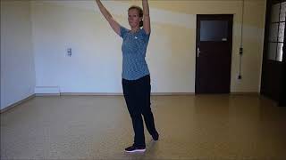 [1 – 12] Hand brush back and fwd, 2x Clap, Hand Brush back and fwd, 1x Clap, ½ turn Circle Walk, Posé