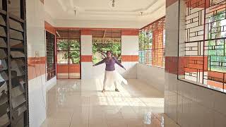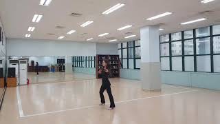 1-2-3-4Bring R arm to R side at hip height (1) Swing R arm from R side up above head (2) L hand holding R wrist while reaching forward (3) Swing both hands down towards L hip (4)