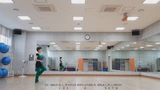 1-2-3-4Walk Forward Right, Left Right, Hitch Left knee while making ¼ turn right 3:00