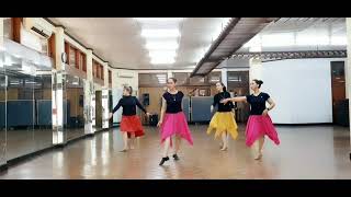 Cross R over L, step L back, turning ¼ right step R side to face front wall and begin again