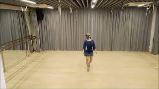 5-6Step forward on LF hitching R knee (Still facing 1:30), Step back on RF sweep LF from front to back