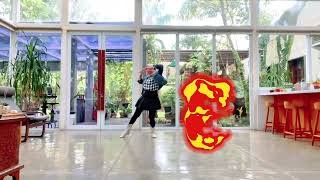 3&RF kick forward right, whilst right arm is above the head in fist slamming door in front of you (3), RF flick backwards ready to kick forward, whilst right arm is above and behind the head in fist position ready to slam the door (&)