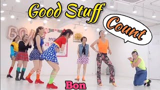 5-65) Step R back and slightly out to right pushing hips right; 6) Step L back and slightly out to left pushing hips left