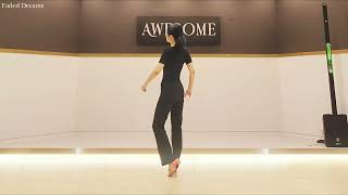 R Forward, Pivot ½, ¼ Side, L Behind, Hitch R, Cross R Behind, ⅛ Forward, Rock/ Recover, ⅜ Forward, ½ Back with Sweep, Back, Tap Forward