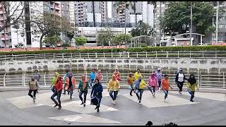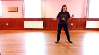 1 – 4touch left heel forward, hook under right knee, touch left heel forward, hook under right knee