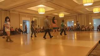Section 4: OUT, OUT, WALK BACK, ROCK BACK, PIVOT 1/4 , CROSSING SHUFFLE