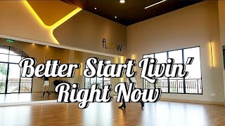 ENDING: During 9th wall, after the box step with cross over (32nd count) facing 12:00, side hop to the right with feet together, raising both hands up from the sides slowly for 8 counts while inhaling, and exhale while lowering hands down to your side for 8 counts.