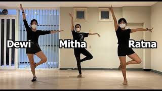 1-2-3Crossing arms over chest twist upper body L (1), release arms next to hips, palms facing down and twist upper body R (2), turn ¼ L stepping onto L and sweeping R ccw