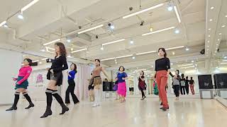 7-8Step RF fwd and sweep the LF with a ½ turn R (facing 3:00) (7), Touch LF fwd – pull your fists on your hips- (8)