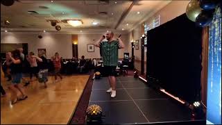 [17 – 24] Rock LRL with R arabesque and flame arms, back R, 1/8 L side L, R cross shuffle