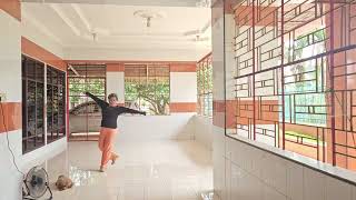 1-2Lunge R to R side opening body to R, Step on ball of L to L side while hitching R over