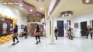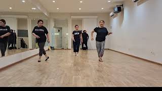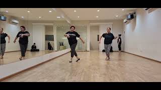 SEC 4 Cross back, hold, ball cross, hold, side-step & bend knee X3, step fwd with ¼ turn with back flick