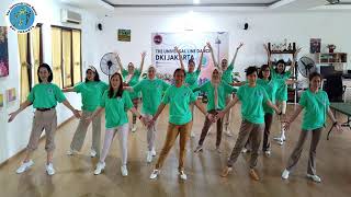 12Stomp L To L Side opening both arms at right angles (90°) at shoulders height and pivot the forearms downwards (1) Swivels: toes out heels in – make pivot the forearms upwards (2)