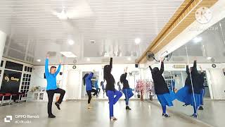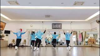 7 – 8Step L to L side (optional: raising your arms forward in the L diagonal) (7), Step R to R side & turn ⅛ R (optional: bringing your in towards your body) (8) 7:30