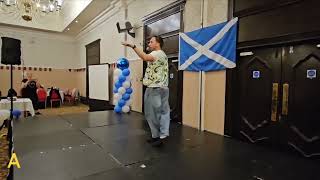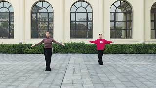 1-2Cross RF over LF and put R arm straight in L diagonal shoulders level as you put L hand on R hand and slide L hand to R elbow (1), Bend elbow and bring back down R arm with L hand pushing R elbow down (2) 12:00