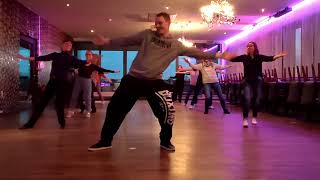 Section 2: (DANCERS ON LEFT SIDE OF DANCEFLOOR): OUT, OUT, IN, IN, DRAG, TOGETHER 1 2Step diagonally forward on R heel (1), step diagonally forward on L heel (2) 3 4Step R back in to centre (3), step L next to R (4) 5 6Long step forward R on very slight R diagonal starting to drag L (5), continue dragging L (6) 7 8Continue dragging L (7), step L next to R (8) *only dancers on L half of the dancefloor dance this section while R half wait