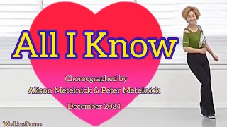 "All I Know" er en 64 counts, 2 wall linedance på intermediate niveau, koreograferet af Alison Metelnick og Peter Metelnick fra Storbritannien i december 2024. Dansen er designet med flydende bevægelser, der harmonerer med musikkens emotionelle dybde og rytmiske intensitet. Alison Metelnick er en erfaren koreograf, der har koreograferet mange danse på alle niveau’er. Hun er kendt for sine kreative trinsekvenser og fokus på musikalsk harmoni. Hun samarbejder ofte med Peter Metelnick, der er anerkendt for sin dygtighed til at skabe danse, der er både teknisk udfordrende og sjove for danserne. Sammen har de skabt mange populære koreografier, der har opnået global anerkendelse. Sangen "All" er udført af Snow Patrol, et kendt alternativt rockband, og kombinerer den emotionelle tekst med stærke melodiske elementer. Snow Patrol er et nordirsk/skotsk band dannet i 1994. Deres musik har en tidløs kvalitet, der appellerer til et bredt publikum, og deres evne til at skabe følelsesladet musik har gjort dem populære på den moderne rockscene.