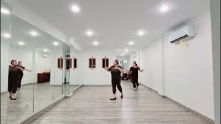 5-8Make ¼ R step LF back (5), Make ½ R step RF forward (6), Make ¼ R step LF to L side (7), Sweep RF to R side (8) 3:00