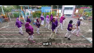 Arms: Cross arms over chest touching R hand to L shoulder & L hand to R shoulder (5), Touch hands to respective shoulders i.e. R hand to R shoulder & L hand to L shoulder (6)