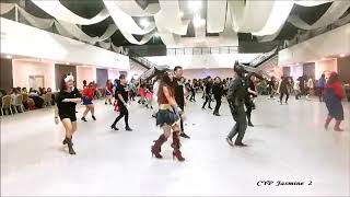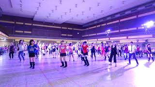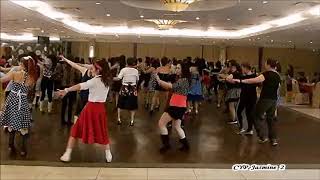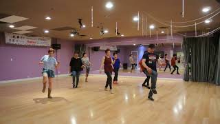 A[1 – 8] Mambo Step, Hitch, Step, Heel Swivel, Step, Scuff, Hitch, Scoot, Step, Jump x2