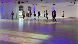 Step LF forward, Step, Lock, Step, Step, Lock, Step, Scuff, Point, Twist R heel and Hip Out, In Out