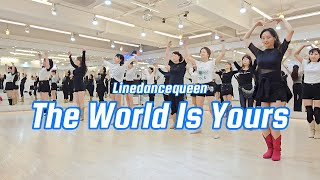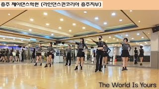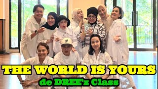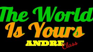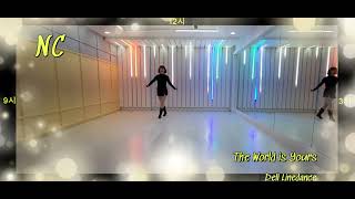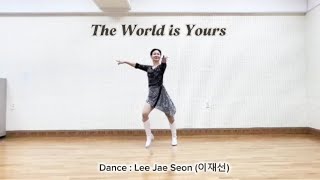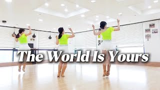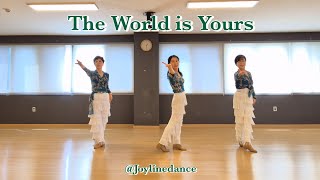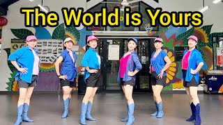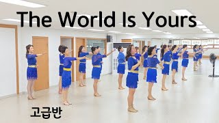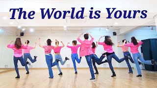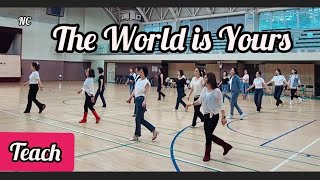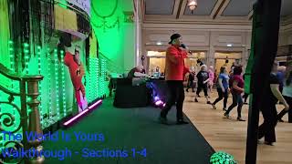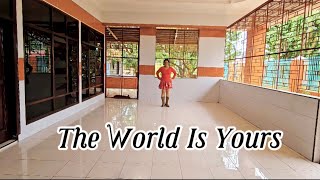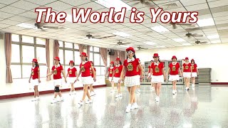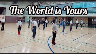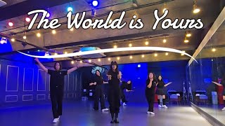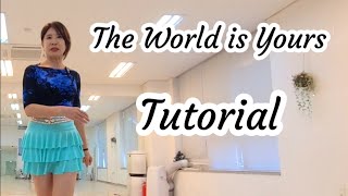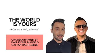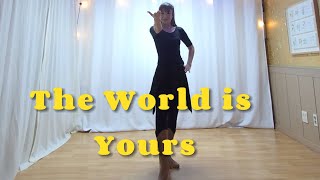 Step R forward and extend R arm forward as the singer says « The World » (6), Pivot 1/2 R and extend R arm forward as the singer says « is yours » (7), Hold (8)