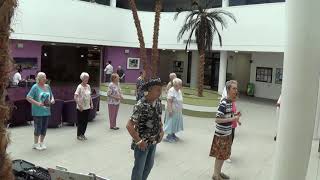 7,8Travelling back step L to L side, kick R across L. (12.00).